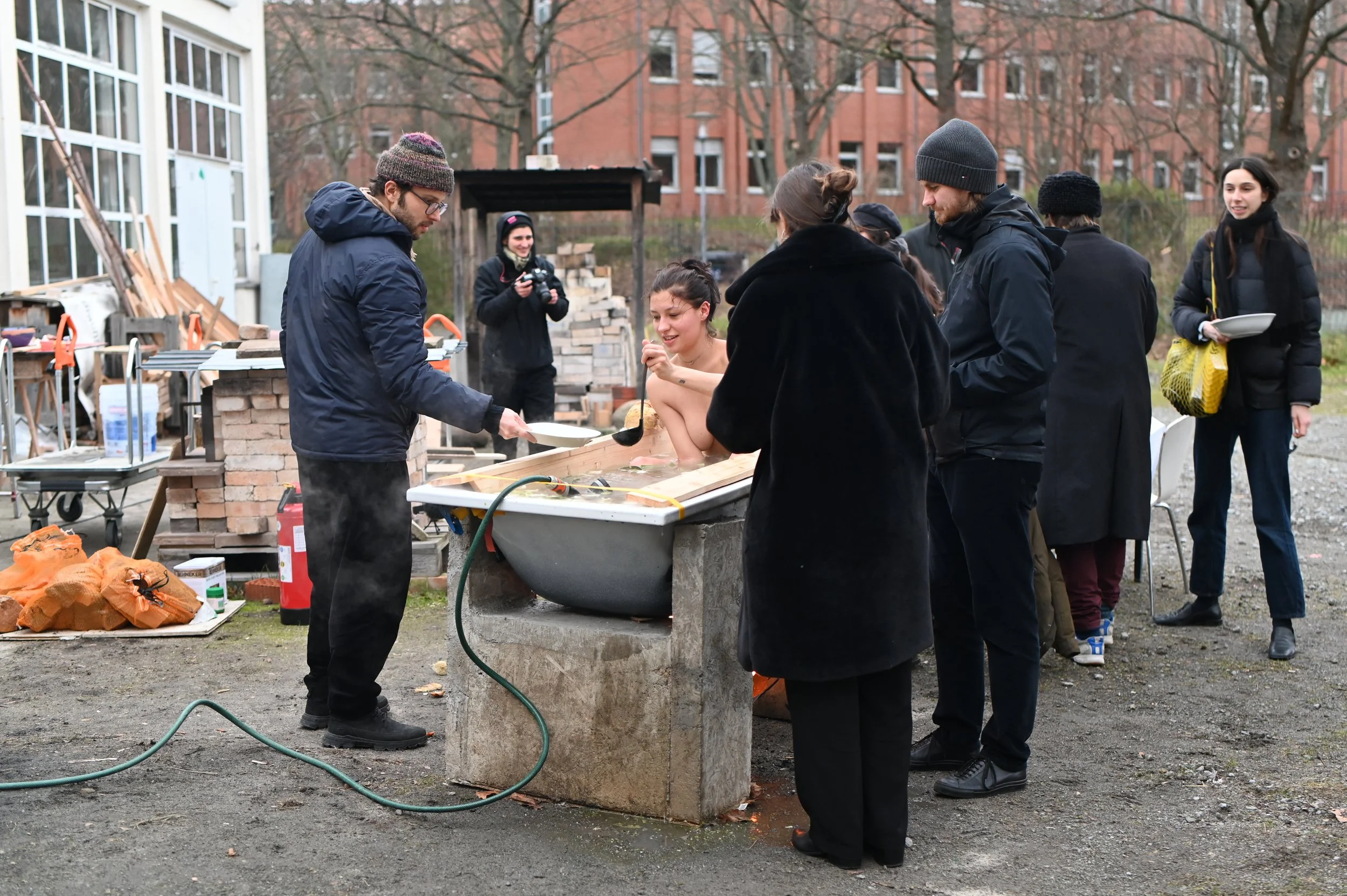 Sofort wird klar: irgendwann wird zu Tisch gebeten. Während die Beiwohnenden noch Abstand halten, bereitet Bossert unbeirrt die Suppe zu. Aus der Ferne sieht es so aus, als säße da jemand in der Badewanne und wüsche sich. Und tatsächlich erinnert die archaische Konstruktion von zwei Böcken mit aufliegendem Behälter und Feuer an sowohl das Kochen als auch das Waschen. Bossert kombiniert beides und schafft einen Bastard, eine Emulsion: